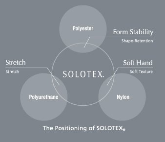 SOLOTEX® is a Polytrimethylene Terephthalate (PTT) fiber developed by Teijin Frontier. Its unique molecular structure forms a flexible, spring-like helix, giving the fiber a soft, lightweight, stretchy, and highly shape-retentive quality.